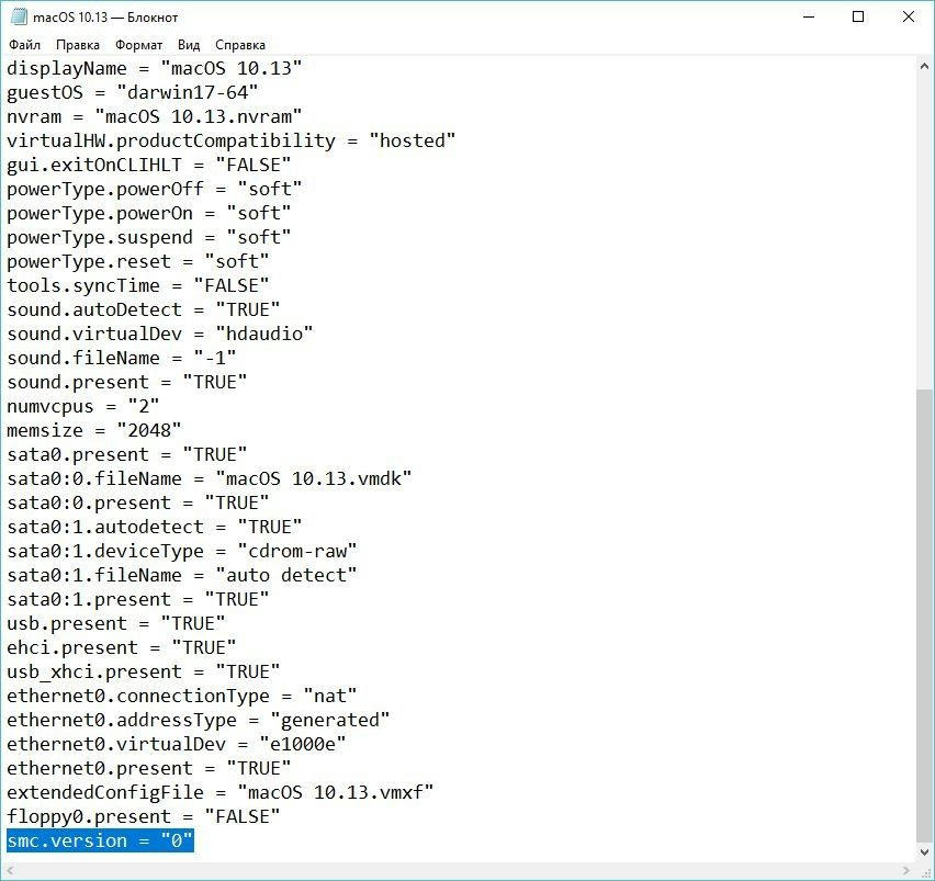 - Перейдите в папку ВМ и откройте файл macOS 10.14 с помощью блокнота. Это небольшой файл размером ~2 Кб. Вставьте туда последней строкою код: smc.version = "0" . Сохраните изменения.