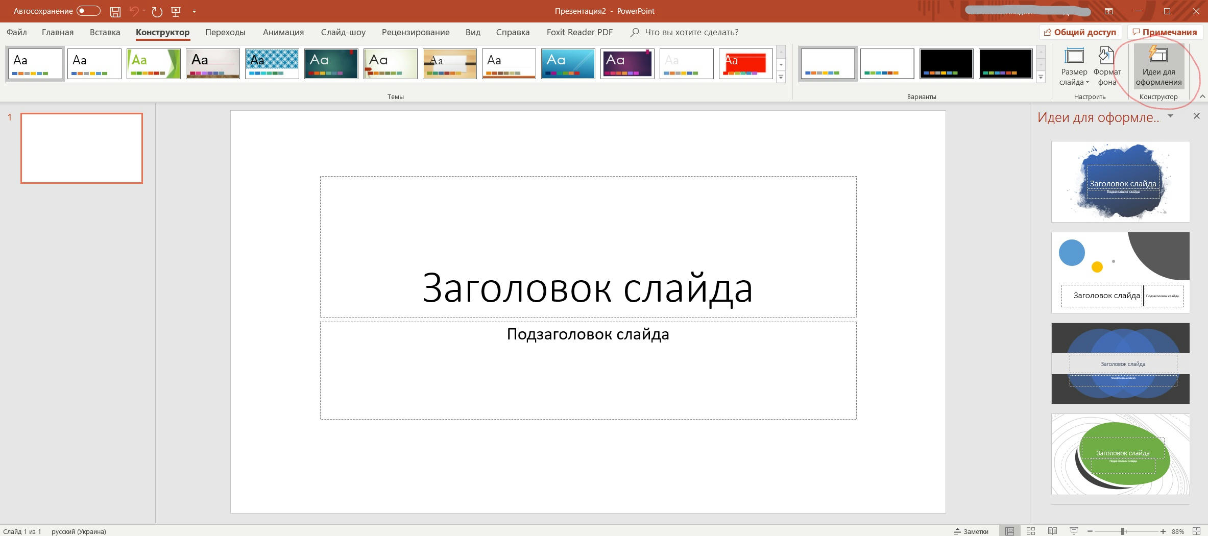 Выбираем пустой слайд и справа на ленте в меню Конструктор щелкаем по кнопке Идеи для оформления. Результат впечатляет: